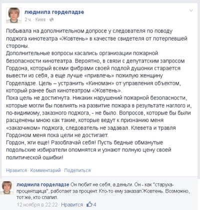 12 ноября Дмитрий Гордон внес на заседание Киевсовета проект решения о присвоении «Жовтню» статуса памятника архитектуры местного значения, а территории вокруг кинотеатра - статуса сквера. Спустя несколько часов после этого на своей странице в Facebook Горделадзе обвинила депутата в попытке рейдерского захвата, в причастности к поджогу, а также в «желании «взять» кинотеатр почти 12 лет назад».