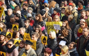 | Общественная акция «Врятуй «Жовтень» 31 октября под зданием горадминистрации на Крещатике. «Был задействован серьезный ресурс: печатная продукция, футболки, флажки. За такой короткий срок (всего сутки) изготовить подобную атрибутику несколько затратно» |