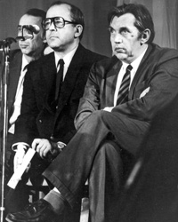 | «Роберт обладал чувством собственного достоинства, которое не перерастало в гордыню, и был прост без панибратства». Пародист Александр Иванов, Виталий Коротич и Роберт Рождественский на вечере «Огонька», 1988 год |