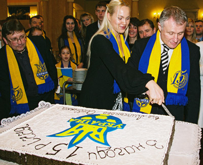 ![]() Первыми именинный торт попробовали президент Федерации футбола Григорий Суркис с супругой Екатериной |