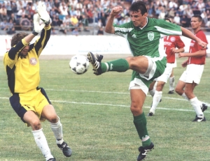 | «Карпаты» (Львов) — ЦСКА (Москва), справа бьет по мячу Иван Гецко, слева — вратарь ЦСКА Виктор Рева, декабрь 1999 года |