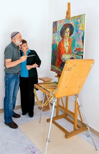 | Со вторым мужем художником Борисом Карафеловым в его мастерской перед своим портретом. «Слабой быть гораздо проще, конечно, если при этом есть тот, на кого можно положиться» |