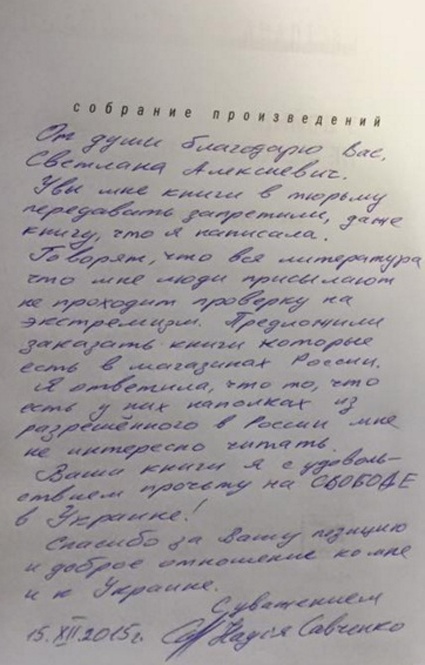 «Алексиевич в тюрьму мне писала, книги свои подарила, одна из них «У войны не женское лицо», но мне ее не дали — там можно только ту литературу читать, которая в их тюремной библиотеке есть»