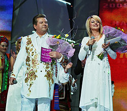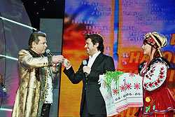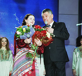 ![]() Не часто на сцене можно увидеть дуэт двух Героев Украины. Вручив Нине Матвиенко диплом за "Квітку чужу", мэр Киева Александр Омельченко запел с ней а капелла "нашу пісню" |