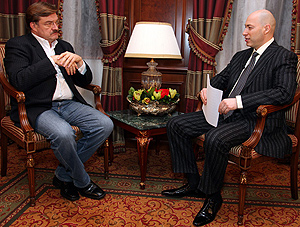 | Евгений Киселев — Дмитрию Гордону: «Журналистика — профессия, предполагающая некое общественное служение. В нее заложено какое-то гражданское наполнение, но это в идеале, а на практике таких людей меньшинство. Большинство же — ремесленники» Фото Александра ЛАЗАРЕНКО |