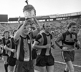 | Финал Кубка СССР. Шахтеровцы Виктор Звягинцев (с хрустальным трофеем), нападающий Виталий Старухин и вратарь Виктор Чанов после игры с «Динамо» (Тбилиси), закончившейся со счетом 2:1, 9 августа 1980 года Фото Анатолия БОЧИНИНА |