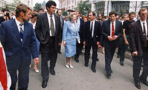 Понимаешь, у нее в голове накрепко утвердились фундаментальные принципы: хорошо — плохо, правильно — неправильно... Никогда не забуду замечательный эпизод: будучи в Нижнем, она пошла в магазин и купила сыру. Выходит, на улице толпа, — Тэтчер приехала! — мы стоим, и какой-то мужик вдруг закричал: «Тэтчер — в президенты России!»...