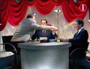 | Телепрограмма «Один на один» Александра Любимова, в финале которой Жириновский плеснул Немцову в лицо соком, стала хитом сезона, 1995 год |