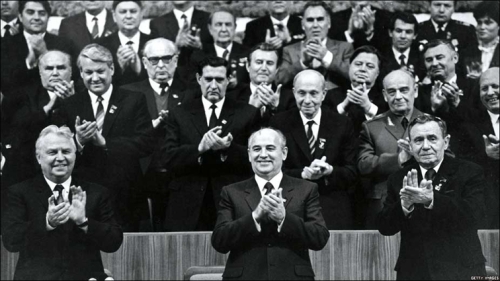 | Егор Лигачев, Михаил Горбачев, Андрей Громыко, Борис Ельцин и другие на мартовском Пленуме ЦК КПСС 1985 года, где Горбачев был избран генеральным секретарем ЦК КПСС |