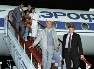 | Чета Горбачевых с внучкой Ксенией возвращается из «форосского плена» в Москву после августовского путча ночью 22 августа 1991 года |