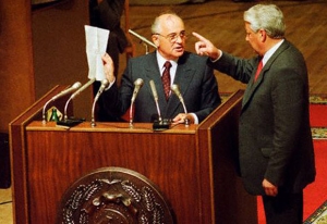 | Президент СССР Михаил Горбачев и президент России Борис Ельцин на заседании Верховного Совета РФ 23 августа 1991 года. На глазах у Горбачева Ельцин подписал указ о запрете Компартии на территории России, после чего обратился к Михаилу Сергеевичу: «И вы тоже подпишите!». На следующий день Горбачев выступил с заявлением о сложении с себя функций генерального секретаря ЦК КПСС |