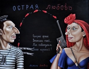 — На картине «Острая любовь». С утра, как и положено: «Я тебя люблю». — «Я тебя — еще больше!». А потом весь день: кто в доме хозяин?! А во второй половине дня озарение. Объявила мужу: «Черный фон — и мы с тобой! Я целюсь в тебя из пистолета!». — «И стреляешь в меня красными перцами!» — добавил он.