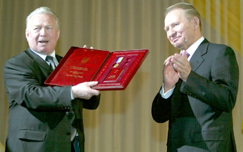 | Президент Украины Леонид Кучма вручает генеральному конструктору КБ «Южное» Станиславу Конюхову орден Державы, 16 апреля 2004 года |