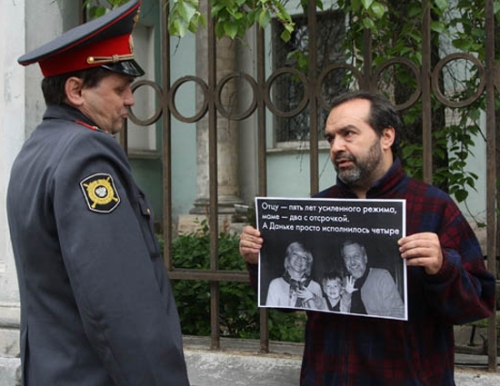 | Одиночный пикет Виктора Шендеровича в поддержку белорусских политзаключенных возле посольства Беларуси в Москве, 16 мая 2011 года |