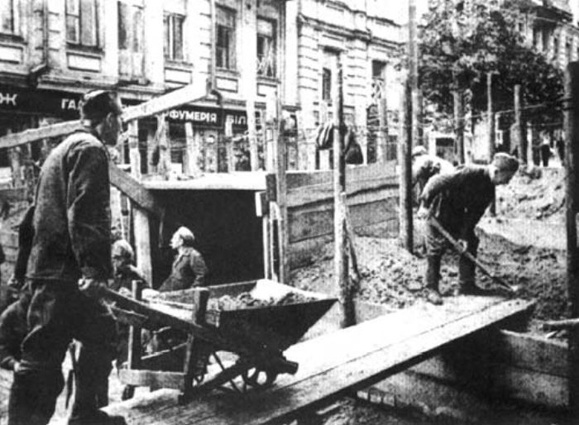Началась мобилизация на копание убежищ от бомб. Это примитивные канавы глубиной в 1,5 метра, сужающиеся книзу. Называются они щели. Роют их везде — во всех садах, скверах и возле домов. Везде, где есть свободная от асфальта и камня земля.