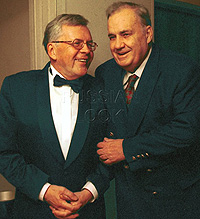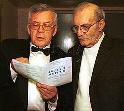 | С Эльдаром Рязановым. «Они много работали вместе. После «Берегись автомобиля» Андрей писал музыку для таких фильмов, как «Гараж», «Служебный роман», «Вокзал для двоих», «Жестокий романс», «О бедном гусаре замолвите слово». Он умел удивительно почувствовать эпоху...» |