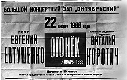 Я вообще считал, что публиковаться в «Огоньке» имеют право лишь Личности, а поэтическая антология и подавно должна представлять человека, наверняка обладающего Собственным мнением. Как Евтушенко. Я уговорил его на составление такой книги, вначале дал в помощь сотрудника «Огонька» Феликса Медведева, помогавшего с отбором текстов и материалами для биографий поэтов, а затем Евтушенко увлекся, сам для себя и для читателей раскрылся по-новому и составил антологию, каких еще не бывало у нас и, полагаю, какие не скоро появятся. Она уже выходила несколькими изданиями, переведена на ряд языков и, я уверен, еще много раз выйдет.