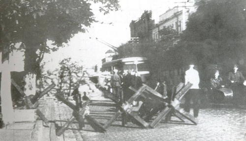 | Противотанковые ежи на улице Ленина (ныне Богдана Хмельницкого). Лето 1941 года |