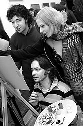 За изобразительными потугами начинающих художников снисходительно наблюдал известный продюсер и президент "Территории А" Александр Бригинец. Ну он-то уже профи со стажем. О чем свидетельствовали развешенные тут же на стенах картины - а выставляет свои творения Бригинец уже более 10-ти лет.