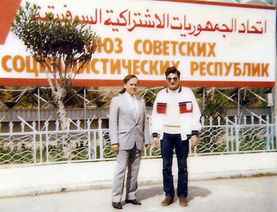 | Борис Михайлов (справа) с коллегой в Ливии, где в 1985 году находилось примерно шесть тысяч советских специалистов. «Условия там тяжелые: пустыня из битого камня — буквально лунный грунт. Несколько десятков человек пришлось отправить обратно в Союз из-за психических расстройств — через год пребывания уходили в пустыню, садились на камне с удочкой...» |