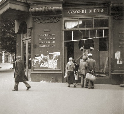 Киевляне перед портретом Гитлера в витрине магазина на углу улицы Карла Маркса (сейчас архитектора Городецкого) и Крещатика, Киев, осень 1941 года