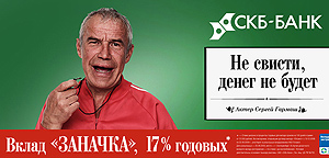 В итоге по всему городу развесили огромные постеры, на которых актер предстает то в образе футбольного тренера (слоган: «Не свисти, денег не будет!»), то таксиста («Крутил педали, пока не дали! Кредиты от 13,9 процента!»), то весельчака с аккордеоном («Эх, поет душа! Ставка хороша!»).