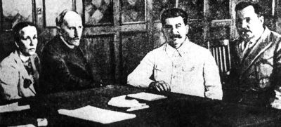 | Французский писатель Ромен Роллан с женой, Иосиф Сталин и Александр Аросев, 1935 год. «Роллан был тусклый сгорбленный старик, больной туберкулезом. Глаза, правда, очень живые...» |