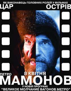Афиша, отдадим должное организаторам гастролей, действительно получилась очень живописной: лицо Мамонова было рассечено пополам, первая половина - Петр Николаевич в роли кровавого самодержца Ивана Грозного из фильма Павла Лунгина «Царь», вторая половина - Петр Николаевич в роли святого старца отца Анатолия из фильма Павла Лунгина «Остров». Обе фотографии венчала надпись: «Петро Мамонов у новiй програмi «Великое молчание вагонов метро».