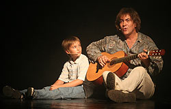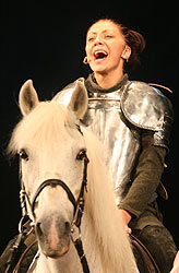 Хостикоев, в последние годы серьезно одержимый режиссурой, как Орлеанская девственница - святыми голосами, вновь взял на себя функции постановщика, а вдобавок незатейливую роль Менестреля - человека с гитарой, возникающего по ходу спектакля раза два и рассказывающего своему сыну Славе историю Жанны (Юлия Вдовенко). Бенюк же оказался еще более многолик, выступив в качестве продюсера и сыграв несколько ролей. Богдан Михайлович просто поражает гигантским объемом своего дарования - кажется, пристегни ему плуг, он еще и вспашет.