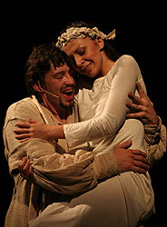 Премьера хостикоевского римейка состоялась 24 августа, в День нашей независимости, и, видимо, задумывалась как подарок всем нам. Может, поэтому спектакль показался каким-то чересчур праздничным и задорным. Вроде бы страдают люди, мучаются, не каются, но "как-то не взаправду и очень издалека". Я не большая ценительница мюзиклов и допускаю, что для подобного жанра такая ситуация вполне допустима. Хочется, конечно, провести аналогию с другой рок-оперой, и тоже на историческом материале, - про графа Резанова и верную ему Кончиту, где все страдают с такой неистовой силой, что просто дух захватывает, но, пожалуй, не надо. Там ведь настоящая love story, а здесь пафосная история народного ополчения.