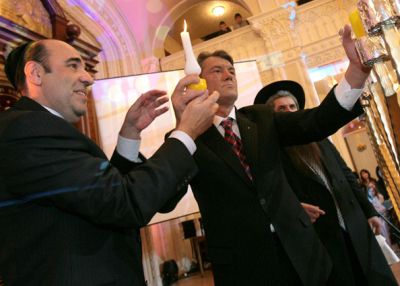 ![]() Президент Украины Виктор Ющенко и Вадим Рабинович на праздновании Хануки в Центральной синагоге Киева |