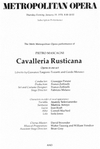 | Спектакль «Сельская честь» Пьетро Масканьи, в котором Соловьяненко исполнял партию Турриду, на афише нью-йоркского театра «Метрополитен-опера» от 19 января 1978 года |