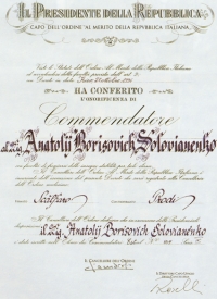 | Диплом о присвоении Анатолию Соловьяненко высшей награды Италии — ордена «За заслуги перед Итальянской Республикой», 1996 год |