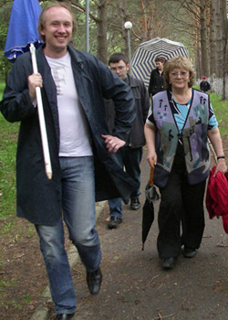 | Студенты курса Аллы Суриковой (справа) идут к ней в гости на дачу. Впереди - Виктор Полторацкий. "Алла Ильинична стала для меня и для всей группы второй мамой" |