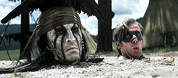 К слову, образ Тонто можно считать приветом «Мертвецу» - культовому метафизическому вестерну Джима Джармуша, где Депп восемь лет назад сыграл бухгалтера Уильяма Блейка, вынужденно бежавшего из кошмарного мира белых людей и окончившего свой земной путь в центре вымирающего индейского племени. Свою лучшую роль, после которой артист совершил не лучший обмен с Голливудом и с тех пор во всех фильмах играет преимущественно знаменитого Джонни Деппа. В «Одиноком рейнджере», впрочем, тоже. Правда, здесь индеец, вышедший в тираж, прячущий три выражения лица под нарочитым гримом, пришелся весьма кстати.