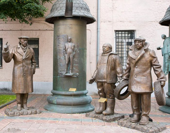 ![]() Скульптурная композиция "Мимино", в которой Зураб Церетели запечатлел в бронзе Вахтанга Кикабидзе, Евгения Леонова, Фрунзика Мкртчяна и режиссера Георгия Данелию, пока находится во дворе Московского Музея современного искусства |