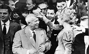 | Прием Никиты Хрущева в Голливуде, справа — Виктор Суходрев, рядом с ним — актриса Ширли МакЛейн. «В честь Хрущева дали большой обед на территории крупнейшей киностудии 20th Century Fox. Кого там только не было — собрался весь цвет Голливуда» |