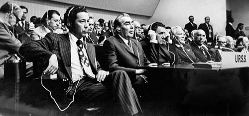 Потом, по случаю подписания исторического документа, лидеры произнесли речи. Первым — Брежнев (я переводил, стоя рядом со сценой перед микрофоном), затем начал выступать Картер, и тут вдруг Леонид Ильич заерзал. Сидя за столом, за которым только что был подписан договор, он стал оглядываться на стоящих сзади него наших представителей. К нему сунулся было Громыко, но Леонид Ильич отрицательно замотал головой, следом подсеменил Черненко — реакция та же... Наконец, подошел Рябенко, начальник охраны. Брежнев что-то ему шепнул, тот резким жестом позвал меня, и я поднялся на сцену.