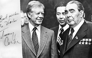 | Автограф от президента США Джимми Картера. Картер, Виктор Суходрев и Леонид Брежнев на переговорах об ограничении стратегических наступательных вооружений, Вена, 1979 год. «Пожимая мне на прощание руку, Картер произнес со своей знаменитой улыбкой: «Виктор, приезжайте к нам снова и привозите своего президента» |