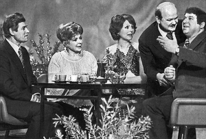 | «Кабачок «13 стульев»: Станислав Микульский (гость), Ольга Аросева (пани Моника), Наталья Селезнева (пани Катарина), Виктор Байков (пан Вотруба) и Юрий Волынцев (пан Спортсмен). «Кабачок» был для папы больной темой…» |