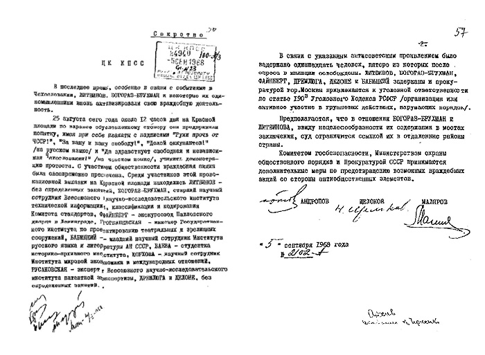 | Объяснительная записка из архивов КГБ, касающаяся знаменитой «демонстрации семерых» 25 августа 1968 года, за подписями тогдашних председателя КГБ СССР Юрия Андропова, министра внутренних дел СССР Николая Щелокова и первого заместителя Генерального прокурора СССР Михаила Малярова |