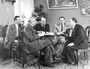 ![]() Слева направо: Андрей Малышко, Мыкола Бажан, Александр Корнейчук, Павло Тычина, Максим Рыльский. 1952 год |