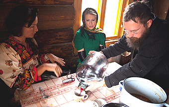 | Герман Львович угощает московских журналисток Ксению Соколову и Ксению Собчак своим домашним вином. «У меня в погребе шикарный набор вин и чач. Никто не спился еще» |