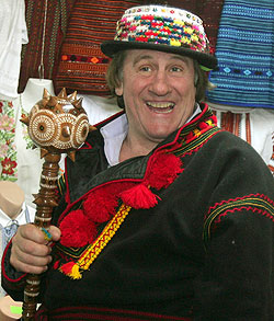 Депардье накупил расшитых одежд и головных уборов аж на пять тысяч гривен. Капелюх за 400 гривен тут же водрузил на голову, подругу порадовал налобником за 500 гривен. Потом выбрал себе кафтан почти за 400 долларов. Приобрел и булаву.
