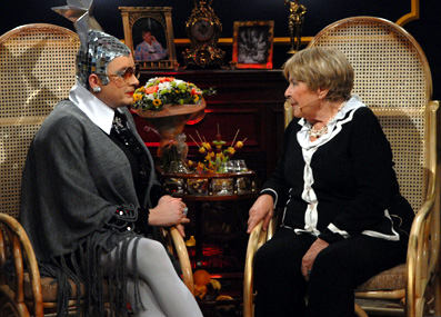 «Меня к тебе, Вера, провожали с флагами!» — восторженно сообщила исполнительница роли пани Моники из знаменитого «Кабачка «13 стульев». В задушевной беседе актриса поведала Сердючке о своем знакомстве с Фаиной Раневской и Анной Ахматовой, о болезнях Андрея Миронова, а также о том, что самым первым алкогольным напитком, который она попробовала в 1941 году, был одеколон «Свежее сено».