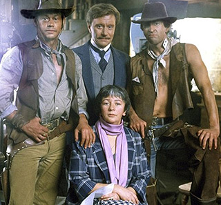| Николай Караченцов, Андрей Миронов и Леонид Ярмольник с режиссером Аллой Суриковой на съемках комедии-вестерна «Человек с бульвара Капуцинов», 1987 год |