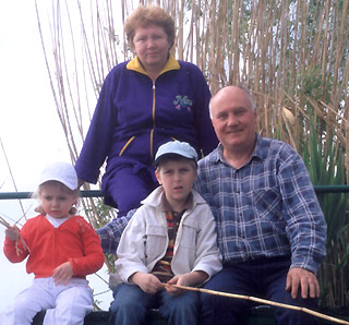 | Иван Николаевич с супругой Валентиной Петровной и внуками Софийкой и Антоном на даче |