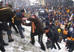 Увы, власть, пытающаяся сегодня удержать свои позиции, перешла некую черту, грань. Я знаю много фактов, подтверждающих это. Достаточно было посмотреть на выбитую челюсть и заплывший багрово-синий глаз народного депутата Украины Юрия Оробца, избитого прямо на избирательном участке, чтобы лишний раз в этом убедиться. А ведь бьют не только народных депутатов, но и губернаторов, министров, причем их непосредственные начальники - кулаками в лицо, выбивая зубы. Спрашивается, зачем нам такая власть нужна?