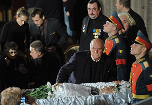 | Похороны Сергея Говорухина, у гроба — отец. «На похоронах был почетный караул, играл образцовый военный оркестр Министерства обороны... Когда опускали гроб в могилу, прогремел салют» Фото «РИА Новости» |