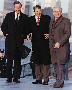 | С Джорджем Бушем-старшим и Рональдом Рейганом в Нью-Йорке, 1988 год. «От капитализма многое следует взять — этого стесняться не надо» |